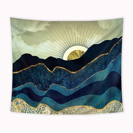 Riyidecor Sunset Oil Painting Tapestry 51x59inch Sun Light Mountain Landscape Sunrise Stripe Gradient Color Blue Art Print Wall Hanging Indigenous